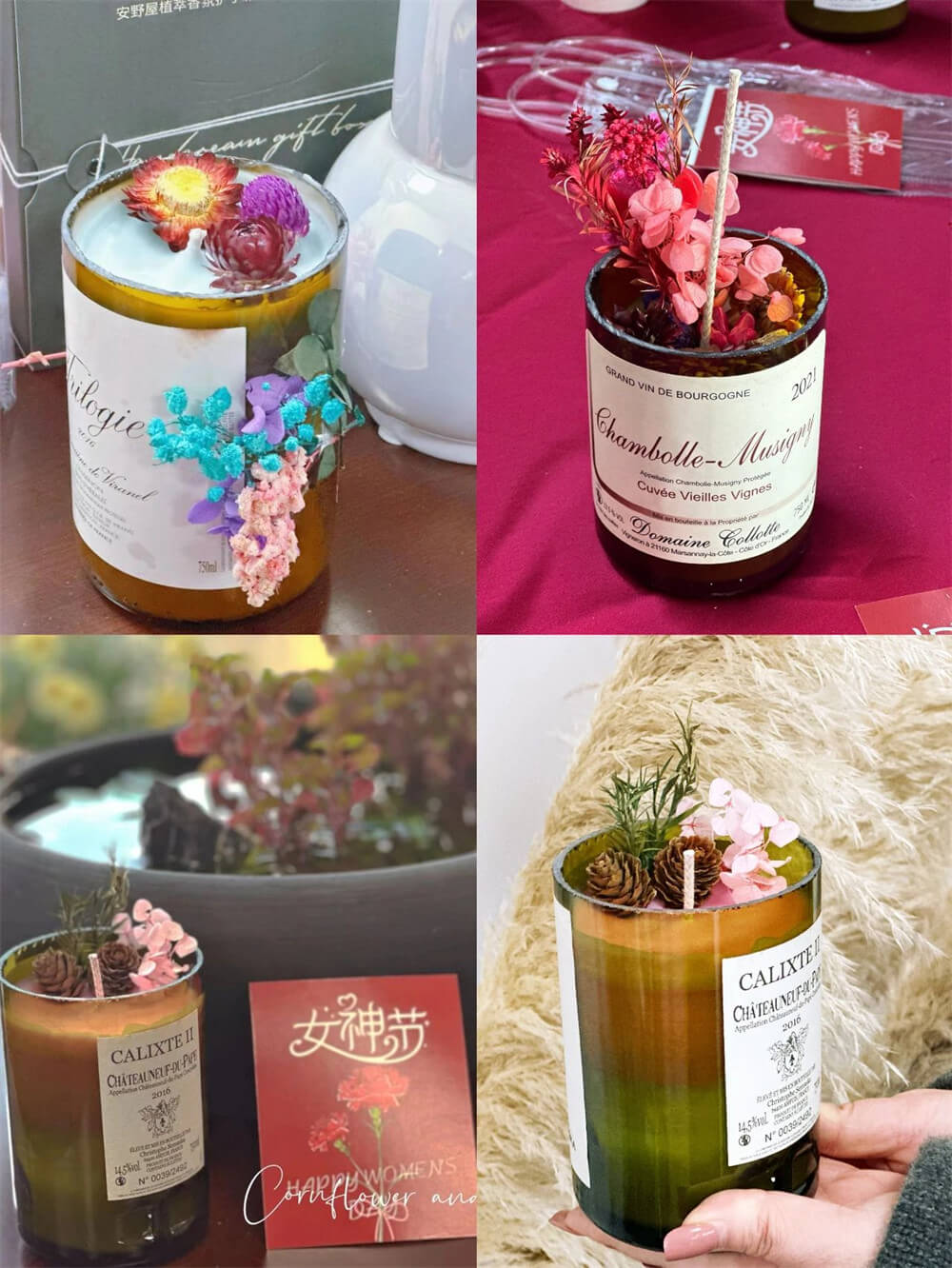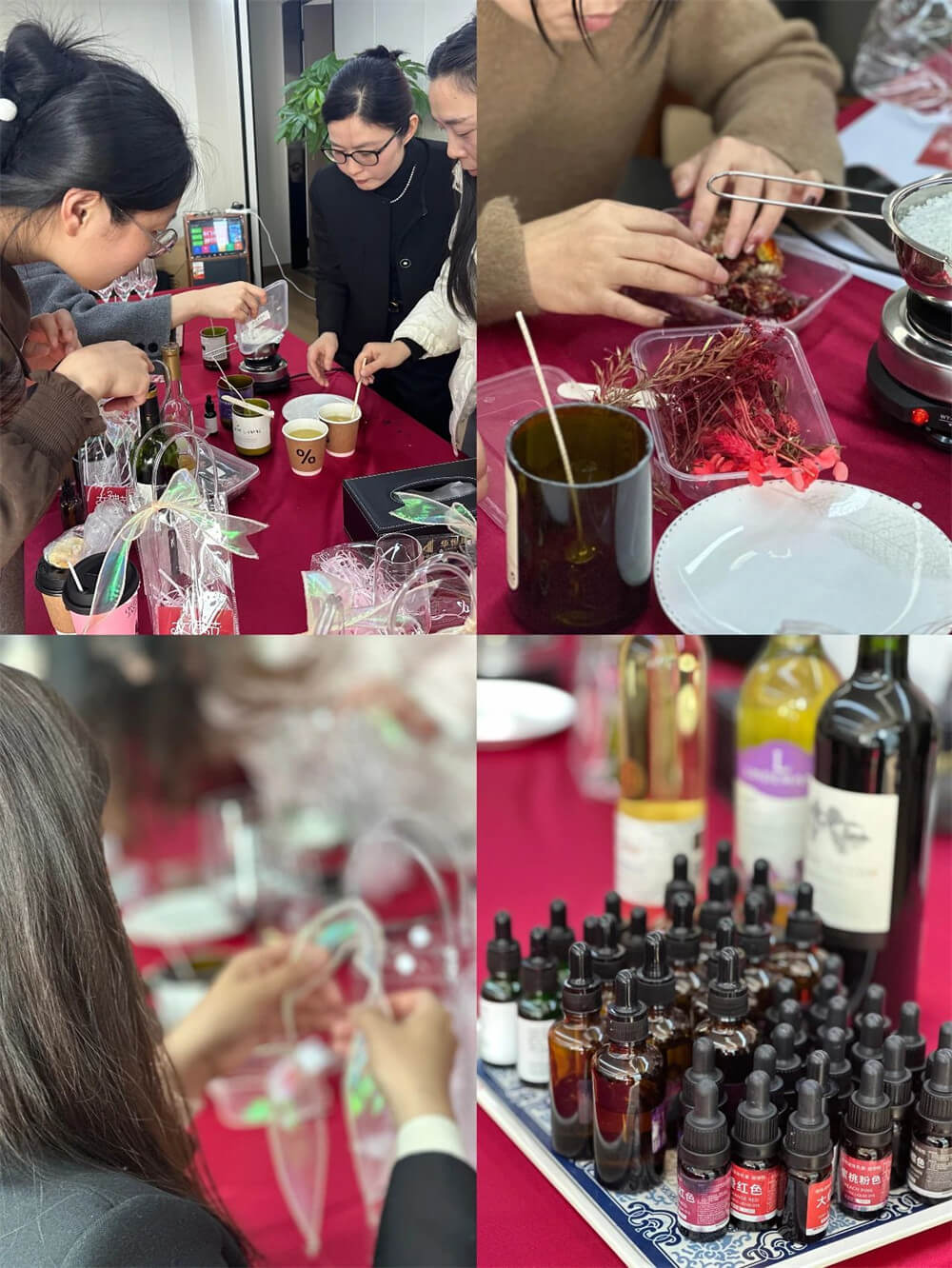 操作時,先加熱融化大豆蠟,在杯底粘好燭芯,接著,滴入精油,當蠟油半凝固時,加上各式干花點綴,讓蠟燭更加美觀獨特,最后,耐心等待蠟油完全凝固,參加活動的女神們欣喜地相互展示自己的作品,每一個作品都因為獨有的審美與情感,更顯出獨一無二的美好!
