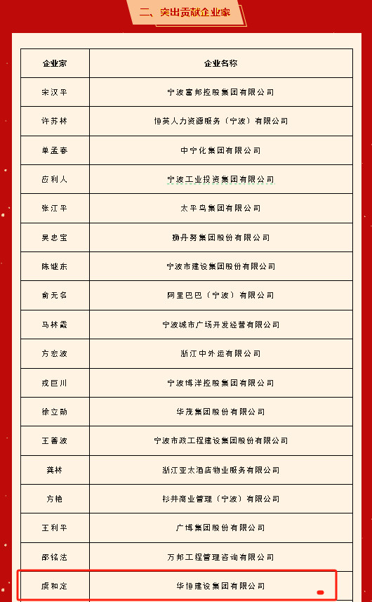 區(qū)委書記徐強(qiáng)出席大會(huì)并致辭,區(qū)委副書記、區(qū)長(zhǎng)葉枝利主持,區(qū)政協(xié)主席張寧輝等參加,區(qū)委副書記羅仙兵宣讀表彰文件。華恒建設(shè)集團(tuán) 虞和定 董事長(zhǎng)獲評(píng)“海曙區(qū)突出貢獻(xiàn)企業(yè)家”榮譽(yù)稱號(hào)。